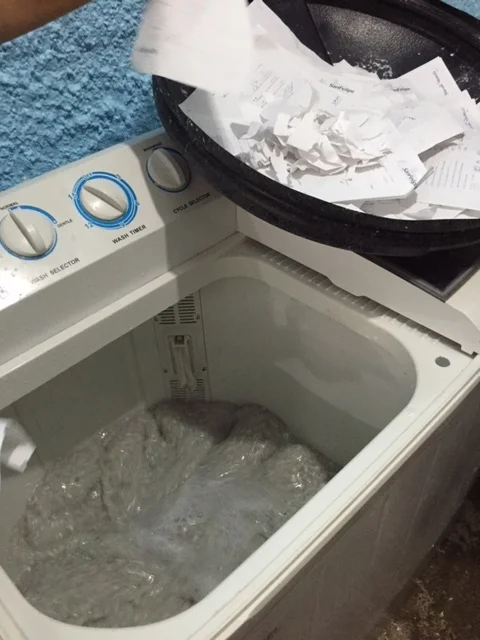 Step 2: Torn pieces go into the washing machine to make liquid for new paper.