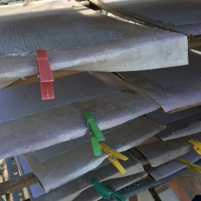 Step 5: After the paper has dried we smooth out each sheet, rolling out the bumps with canisters filled with rocks or really anything with a hard edge...like a deodorant roller. The "Thank you card" pictured below is the finally product!